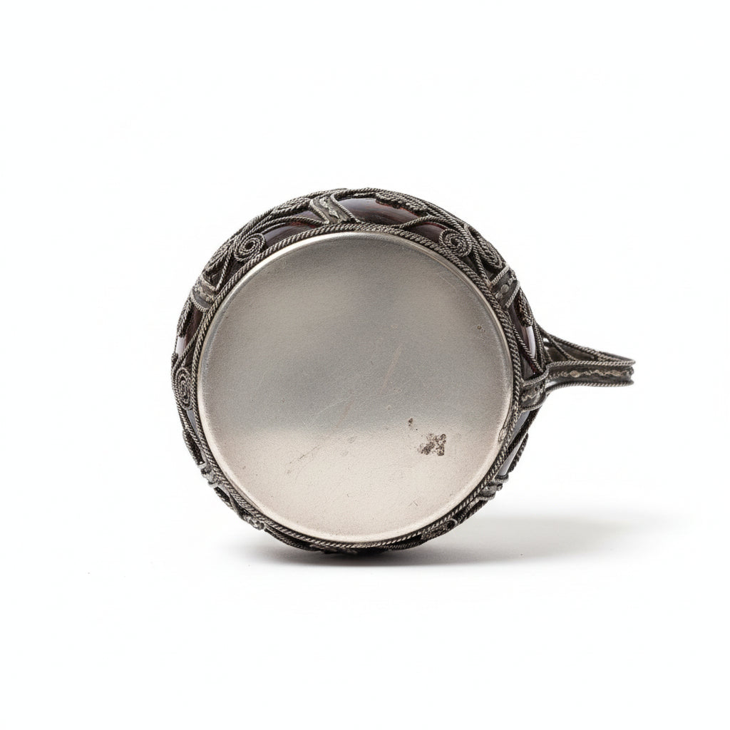 Crafted through traditional hand-blowing techniques, this amber-rose glass pitcher combines functional elegance with artistic flair. The decorative wire detailing adds a sophisticated accent that catches light beautifully, making it equally suited for everyday use or display. Perfect for serving beverages or as a striking standalone piece, its warm tones and artisanal quality bring warmth to any table setting or shelf.