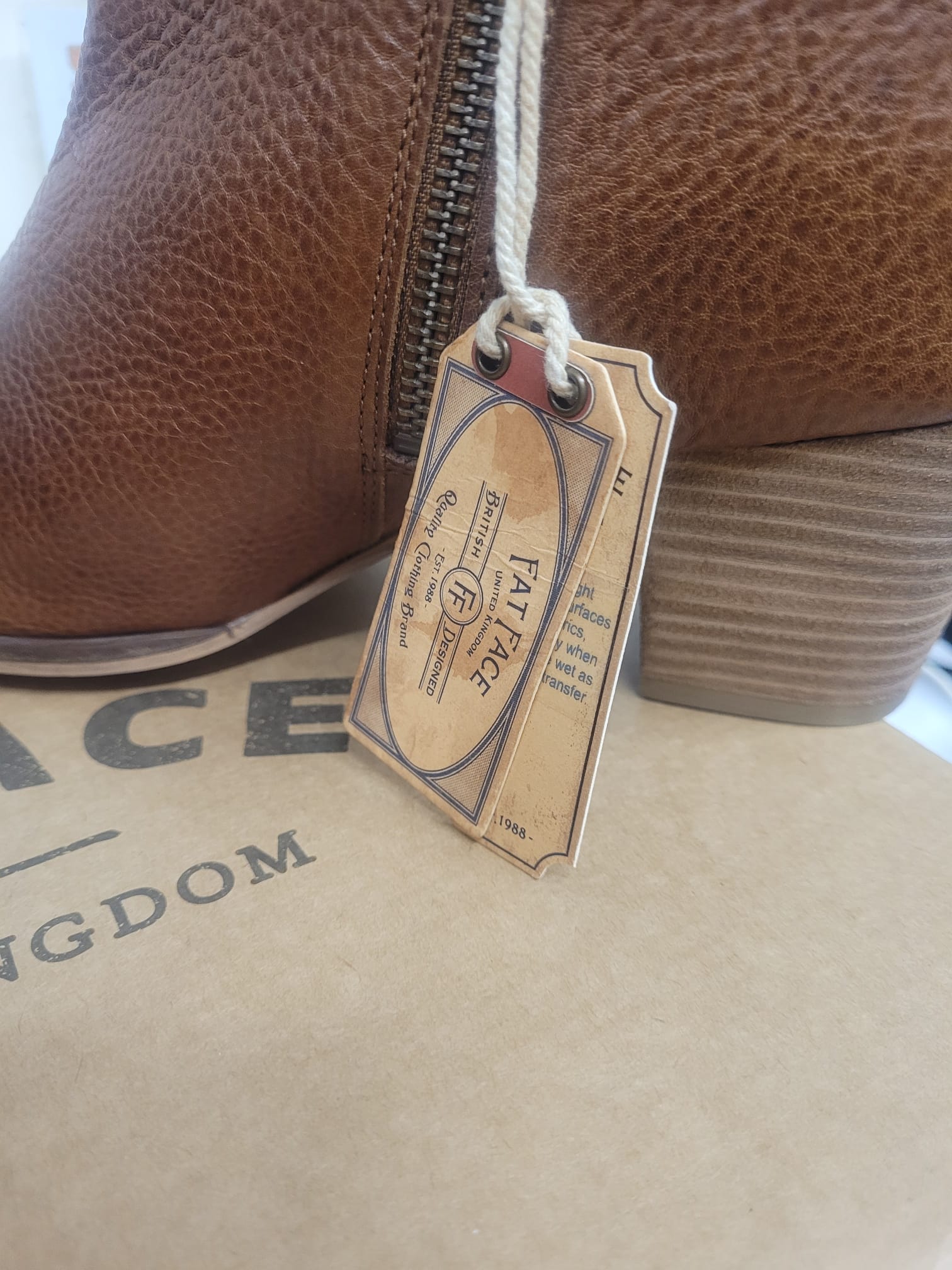 Brand new in box Fat Face ankle boots in a rich acorn brown leather. These UK size 7 (EU 40) heeled boots feature a practical side zip closure for easy on and off. The quality leather construction and modest heel height make them versatile for both casual and smart-casual styling. Perfect for autumn and winter wardrobes, these boots offer timeless appeal at an excellent value.