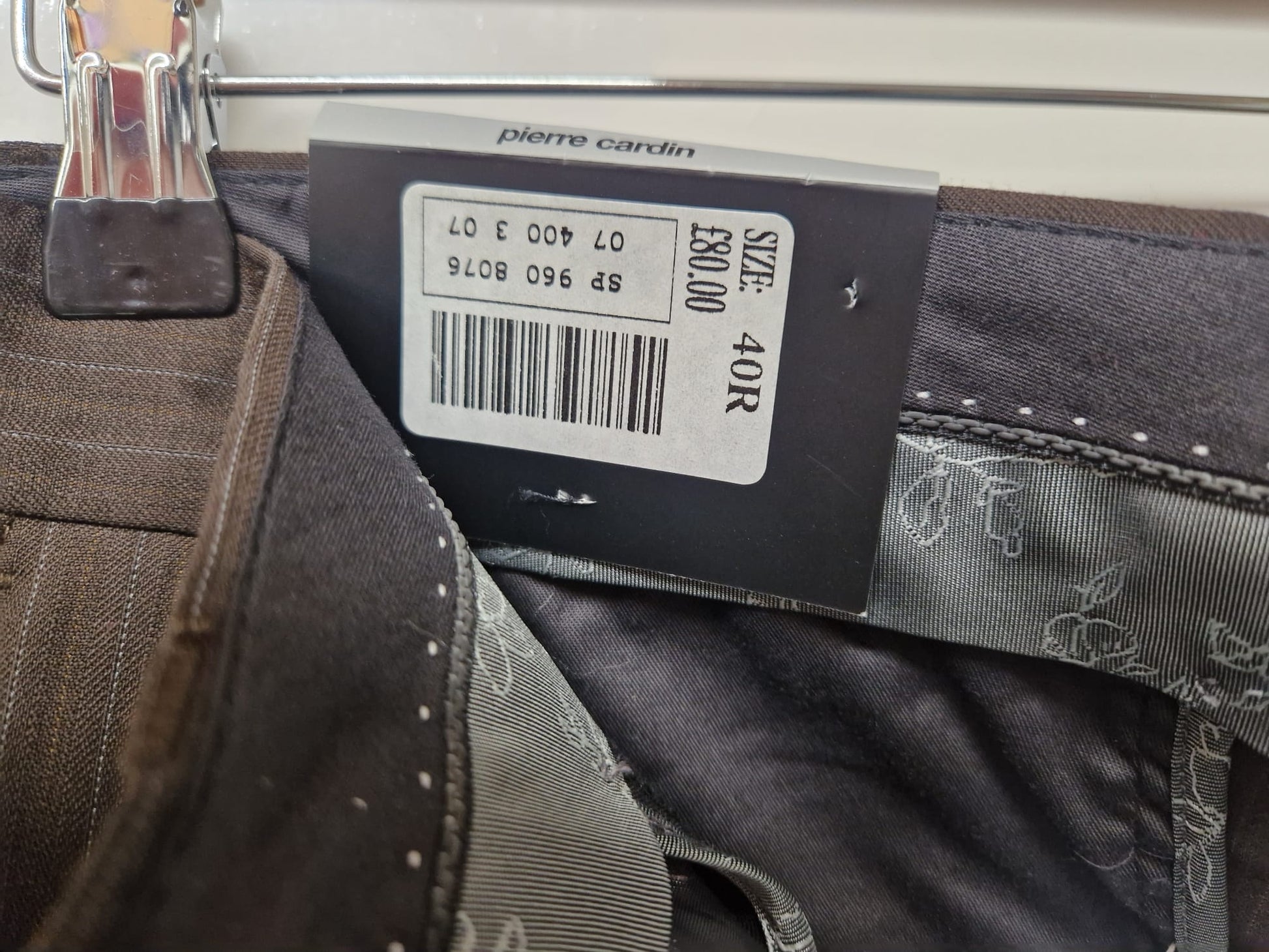 BNWT Pierre Cardin brown pinstriped trousers in a classic 40 Regular fit. These tailored trousers feature a sophisticated vertical pinstripe pattern in premium fabric, offering versatile styling for both professional and smart-casual occasions. Originally retailed at £80, this unworn pair delivers exceptional value for quality menswear. The structured cut and refined finish are hallmarks of Pierre Cardin's enduring design heritage, making these an ideal addition to any wardrobe seeking timeless elegance and reliable craftsmanship.