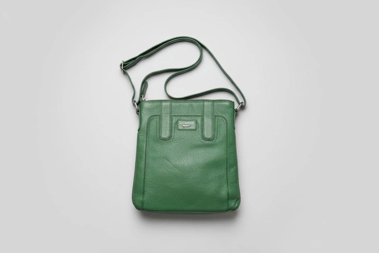 Paul Costelloe Green Leather Crossbody Messenger Bag Crafted from supple green leather, this crossbody messenger bag combines timeless design with practical functionality. The adjustable strap allows for comfortable wear across the body, whilst the structured silhouette accommodates daily essentials with ease. Ideal for professionals and commuters seeking a versatile accessory that transitions seamlessly from office to weekend. The rich leather develops character over time, ensuring this piece becomes a trusted companion for years to come.