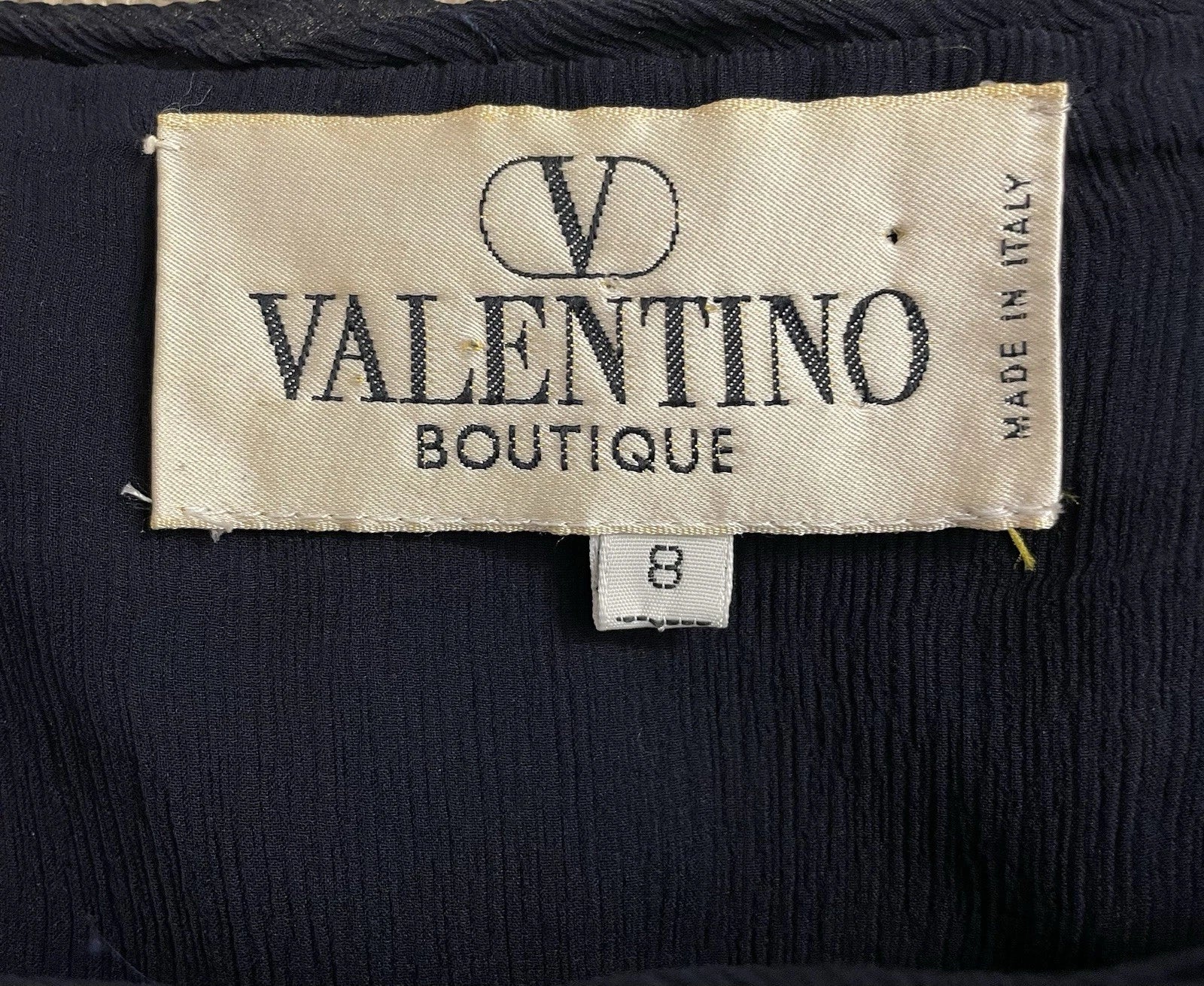 The S/S 1995 Valentino Garavani Runway Navy Crepe Chiffon Pearl Ruched Mini Dress is a vintage, formal dress designed for women. Made from crepe chiffon fabric, this short navy dress features a round neckline, strappy sleeves, and a zip closure. The ruched detailing adds a touch of elegance, making it perfect for summer and spring occasions. This timeless piece from the renowned Valentino brand is a must-have for any fashion-forward woman looking to make a statement.