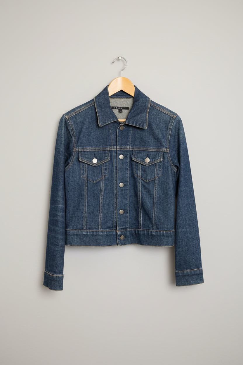 A classic Theory denim jacket in a versatile dark blue, sized medium and in good used condition. This timeless piece features quality construction and a refined fit, perfect for layering across seasons. Ideal for adding understated sophistication to casual or smart-casual outfits. A reliable wardrobe staple from a trusted brand.